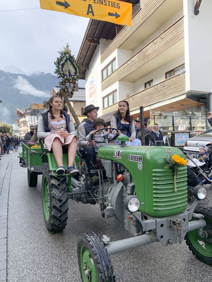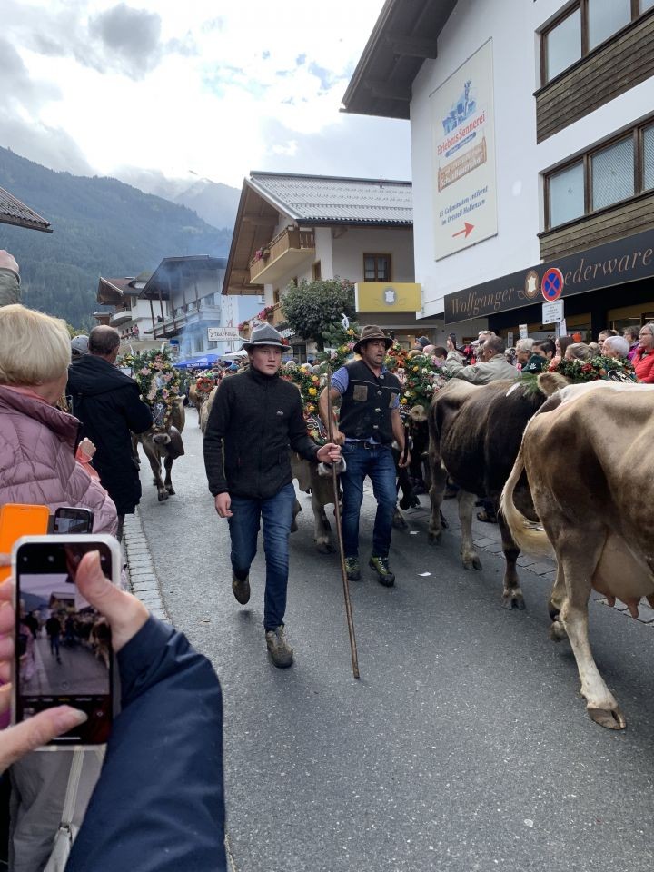 Nous avions choisi de vivre la Fête de la transhumance à Mayrhofen, un petit village du Tyrol bien entouré des Alpes. Dès le petit-déjeuner terminé, nous avons envahi les rues du village afin d'y dénicher quelques produits du terroir et objets souvenirs, tels que les boules de Noël personnalisées, puis avons pris place au bord de la rue en attendant les premiers animaux.