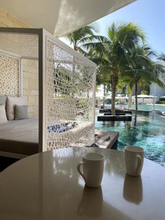Il existe également un menu service aux chambres plus élaboré que nous pouvons télécharger à l'accueil ou visualiser sur le téléviseur de notre chambre et ce service demeure grandement encouragé. Les amis qui me connaissent savent que j'aime organiser des soupers privés lors de mes séjours, et sur ce point, ce fut mémorable! J'ai beaucoup apprécié mes soirées me permettant de profiter de ma terrasse « swim out » au bord de la piscine, avec une bonne bouteille.